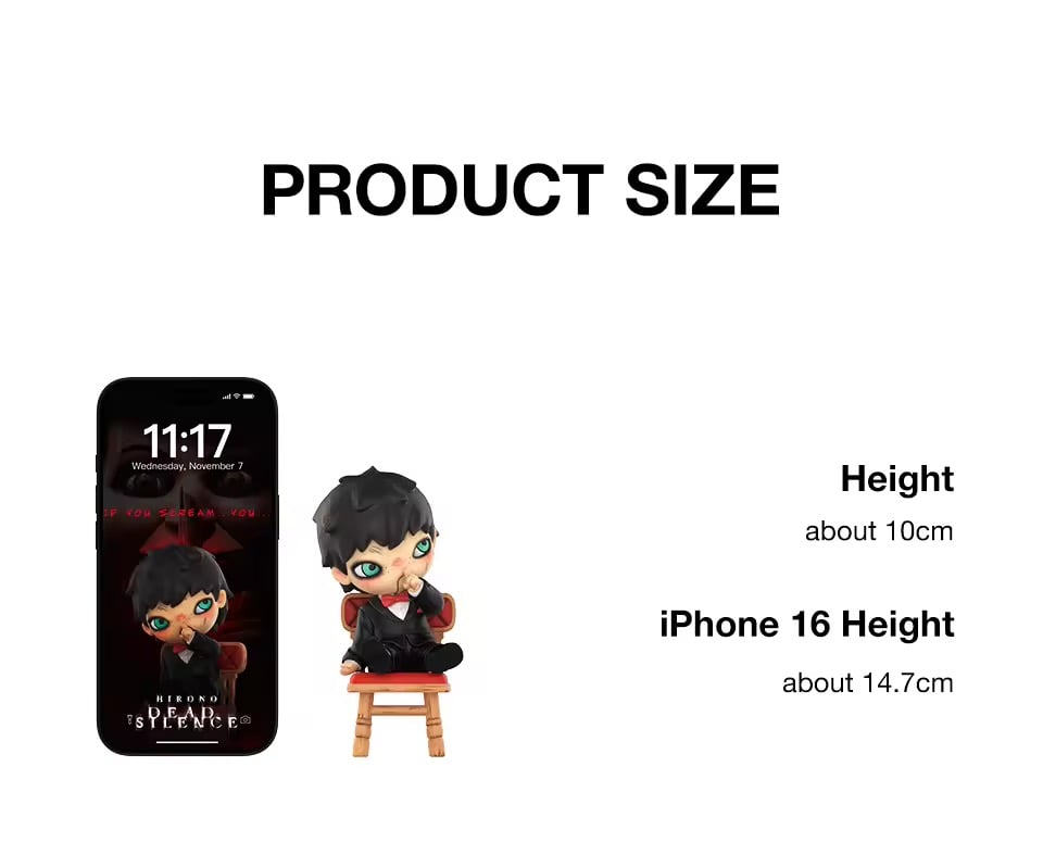 يقدّم هذا الإصدار تعاوناً استثنائياً يجمع بين أسلوب هيرونو الفني الهادئ وعالم الصمت المميت – Dead Silence الغامض. يأتي المجسم بتصميم فريد يعكس مزيجاً من الجمال الداكن والفن الهادئ، مع تفاصيل دقيقة تبرز ملامح هيرونو بأسلوب أكثر غموضاً وجاذبية.